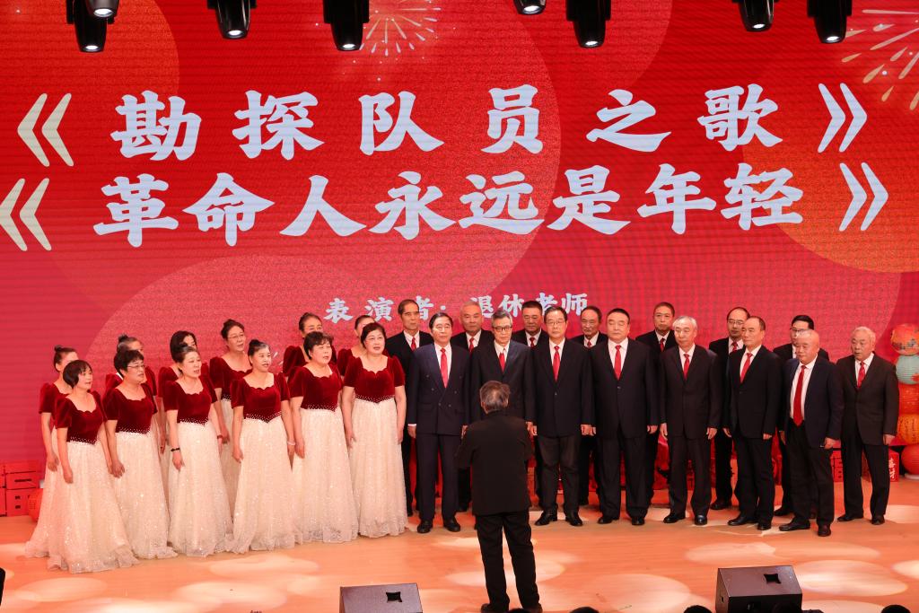 晚会最后,全体退休教师共同唱响经典歌曲《勘探队员之歌》与《革命人永远是年轻》。作为地矿行业的精神符号,《勘探队员之歌》诞生于1952年,歌词“我们满怀无限的希望,为祖国寻找出富饶的矿藏”唱出了一代代地质工作者的初心与使命,其辽阔开朗的旋律、火焰般的热情,激励着无数地矿人不畏艰险、奋勇前行。熟悉的旋律响起,全场师生齐声合唱,歌声铿锵有力、响彻礼堂,彰显了我校传承地质精神、勇担时代使命的坚定信念。