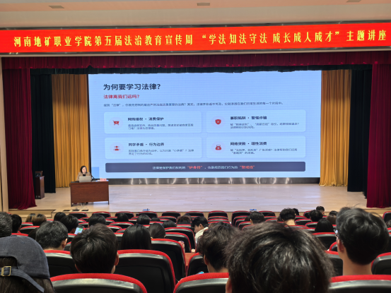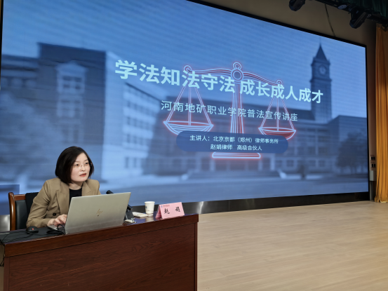 为深入推进法治教育普及,引导广大师生树立正确的法治观念,增强法治意识和自我保护能力,助力学生健康成长、全面发展,在第五届法治教育宣传周期间,我校成功举办“学法知法守法 成长成人成才”主题讲座。本次讲座特别邀请了北京京都(郑州)律师事务所赵娟律师担任主讲人,全体师生代表现场聆听了讲座。