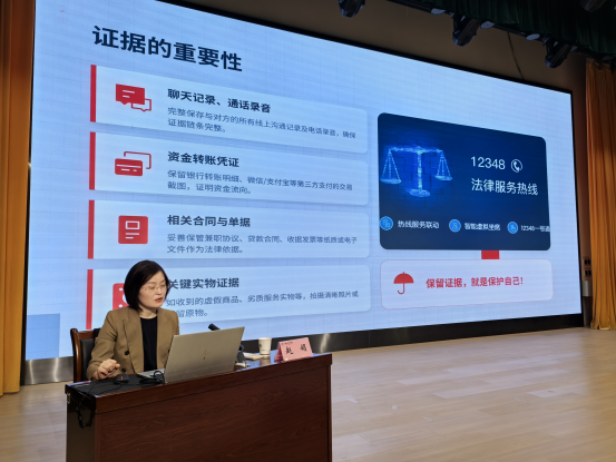 讲座中,赵娟结合自身丰富的执业经验,围绕青年学生成长过程中常见的法治问题,以通俗易懂的语言、真实典型的案例,深入浅出地讲解了与学生密切相关的法律知识。重点针对校园欺凌、网络诈骗、未成年人保护、预防未成年人犯罪等热点问题,详细解读了《中华人民共和国民法典》等相关法律法规,剖析了案例背后的法律风险和教训,引导同学们认清违法犯罪的危害,学会运用法律武器维护自身合法权益。